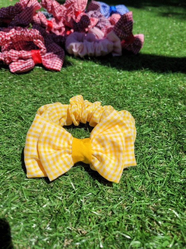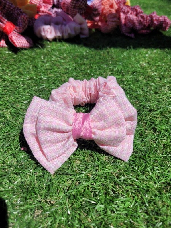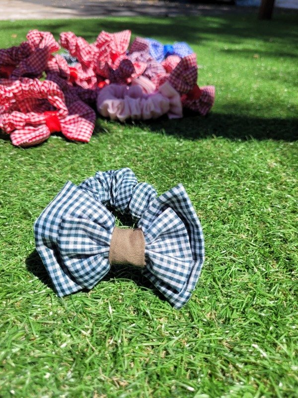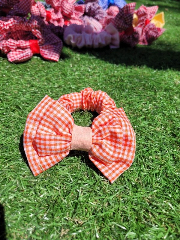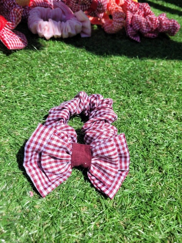 Scrunchie elástica con moño XL desmontable en tela cuadrillé rojo y blanco. El accesorio perfecto para peinados dulces, cómodos y con estilo.